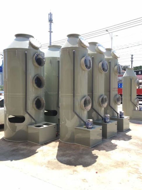 本工藝采用兩臺自主設(shè)計的改型的噴淋塔串聯(lián)使用。風(fēng)機安置于兩塔之間,以防止其被油性氣體污染腐蝕,同時保證抽風(fēng)效果。噴淋塔,在極性吸收液的作用下吸收極性有機分子,進行除油、除煙塵凈化處理;處理后的廢氣經(jīng)過風(fēng)機進入2#噴淋塔,在非極性吸收液的作用下吸收非極性有機分子,進行除異味凈化處理,達標排放。噴淋塔是藥劑噴淋處理工藝中的關(guān)鍵設(shè)備。針對PVC塑料生產(chǎn)廢氣,設(shè)計采用PP材質(zhì)的噴淋塔。噴淋塔內(nèi)部由隔層隔開。